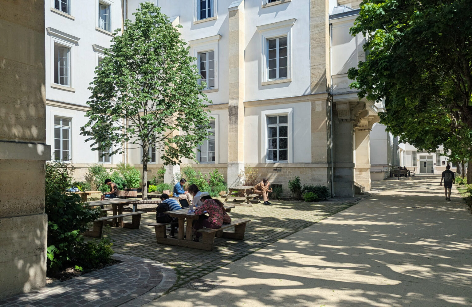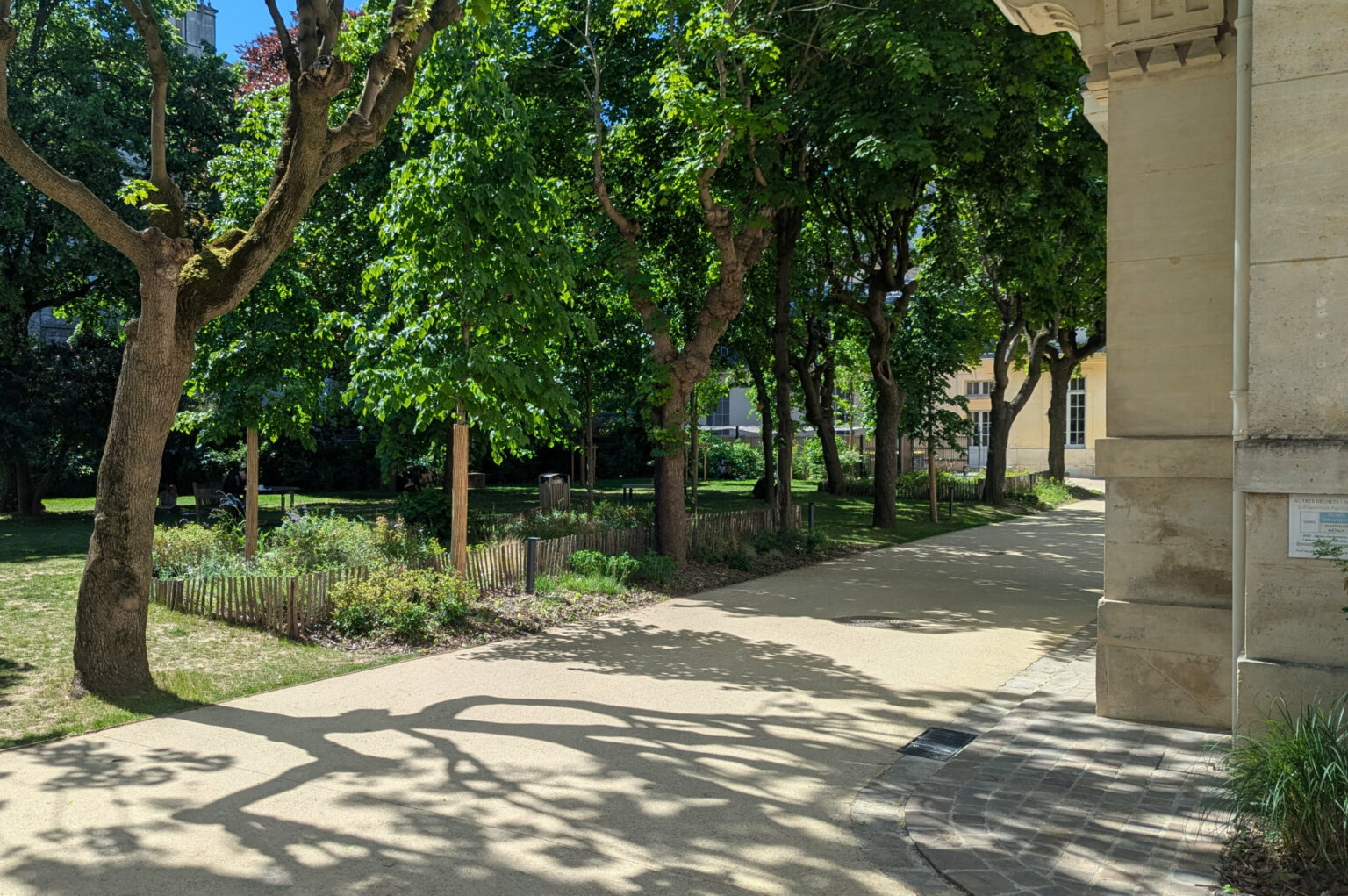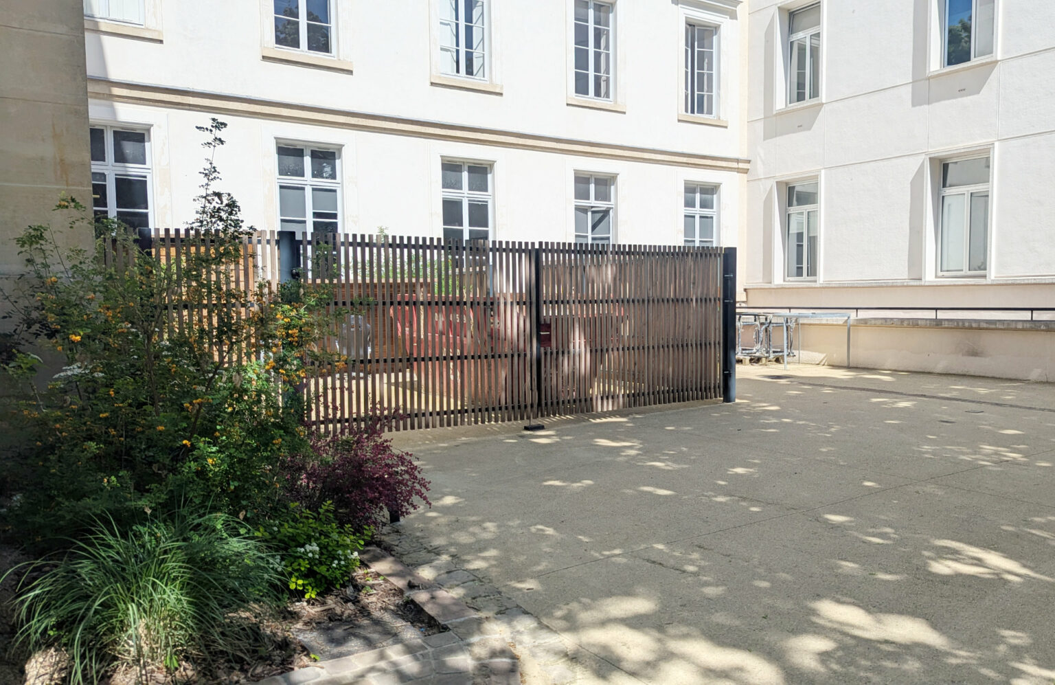 Réaménagement d’une cour-jardin comprenant une allée principale (voie pompiers), le jardin, deux courettes dont une emblématique et des zones techniques.