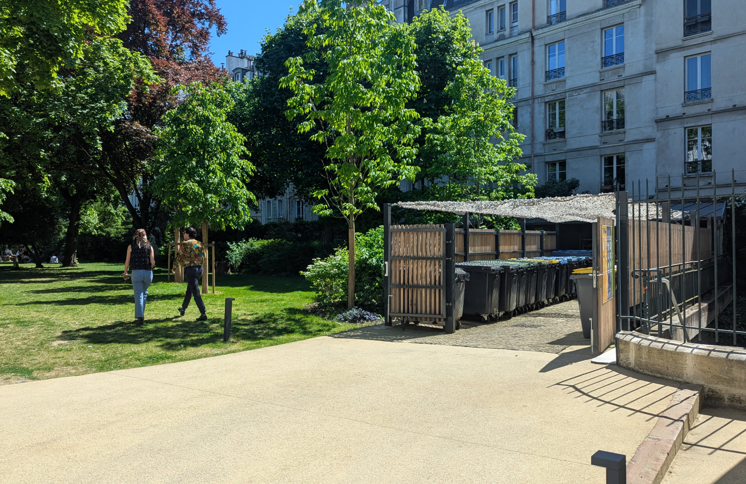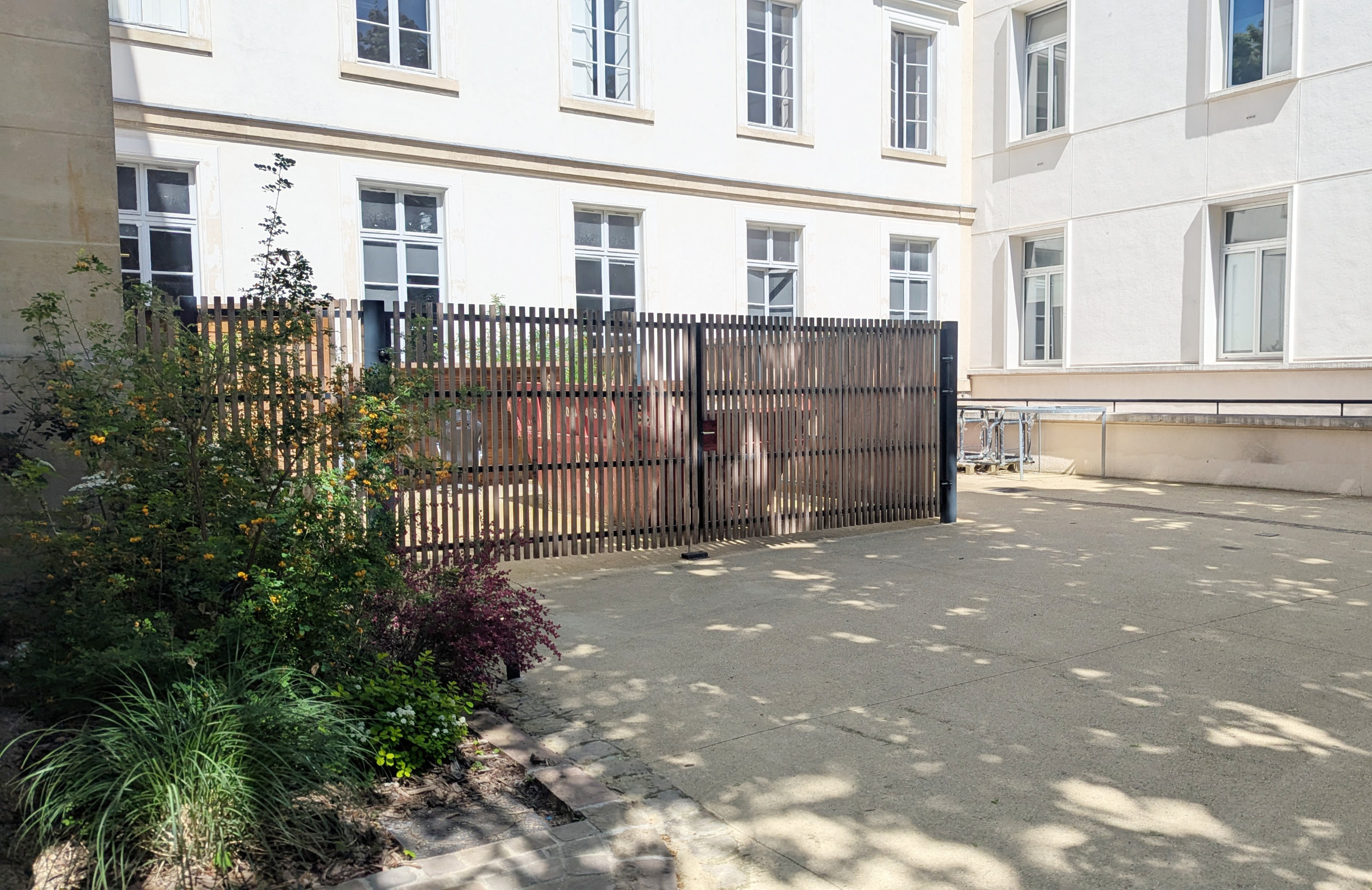 Site au statut d’espace vert protégé (EVP ) impliquant : réalisation d’un dossier de DP, maintien des sols perméables, conservation des arbres existants, mobiliers non scellés, etc. / Serrureries bois-métal sur-mesure pour le masquage des zones techniques