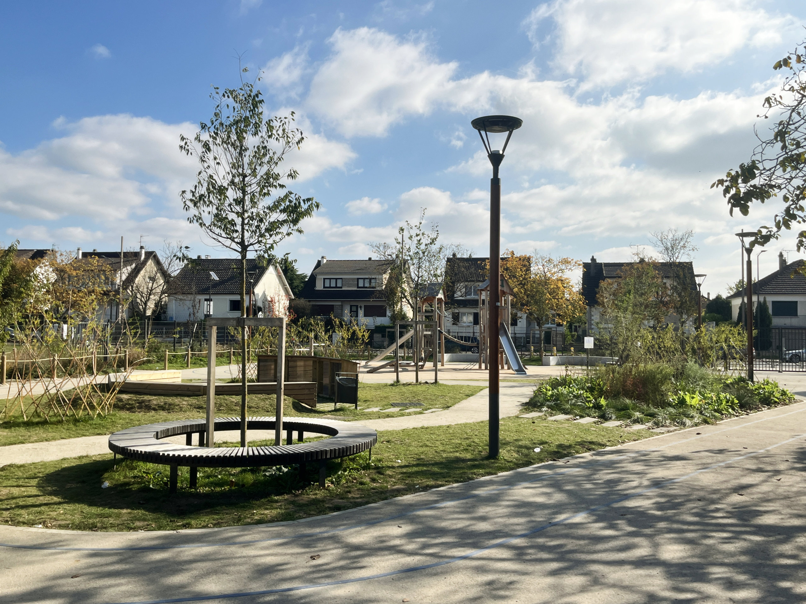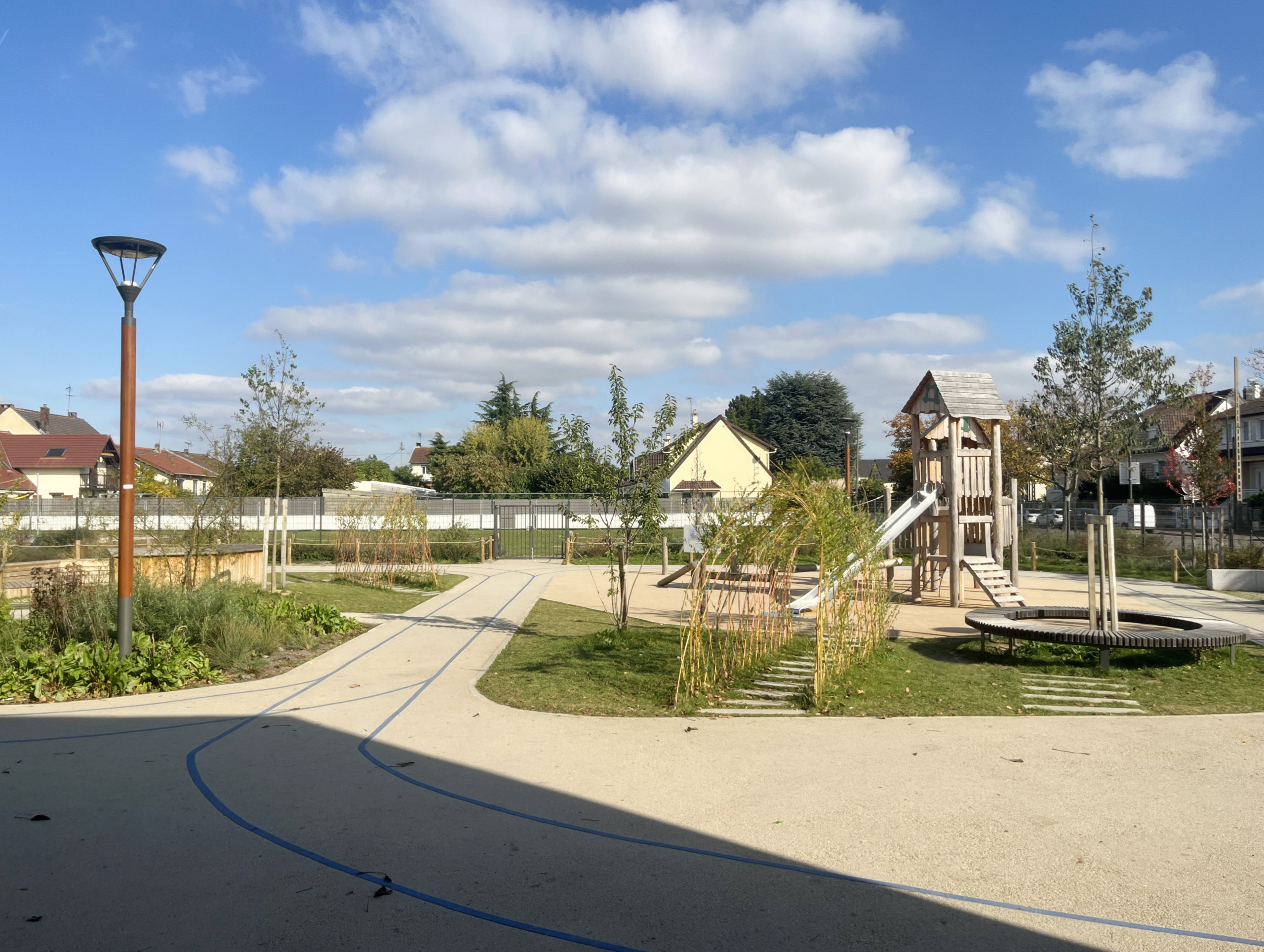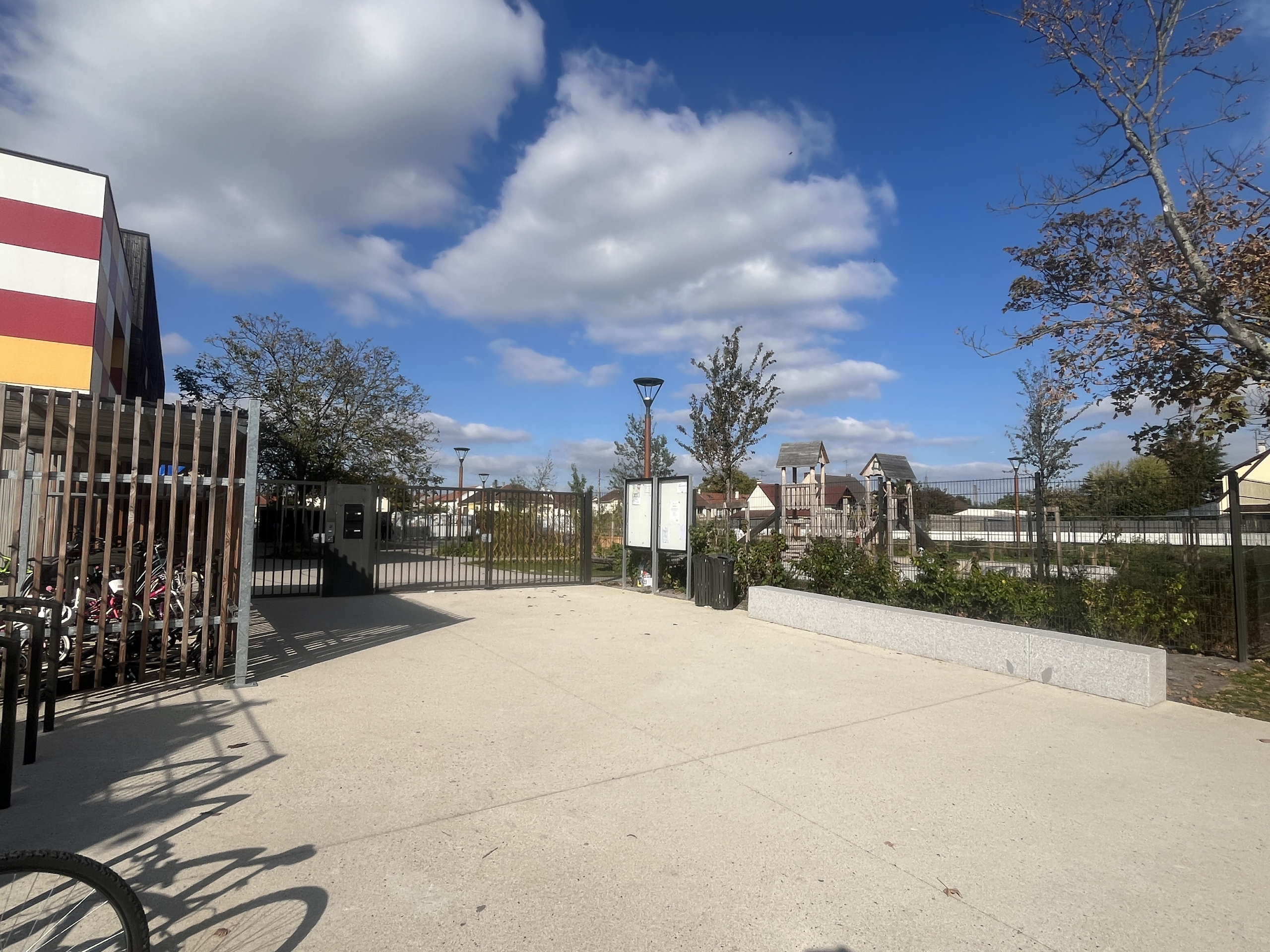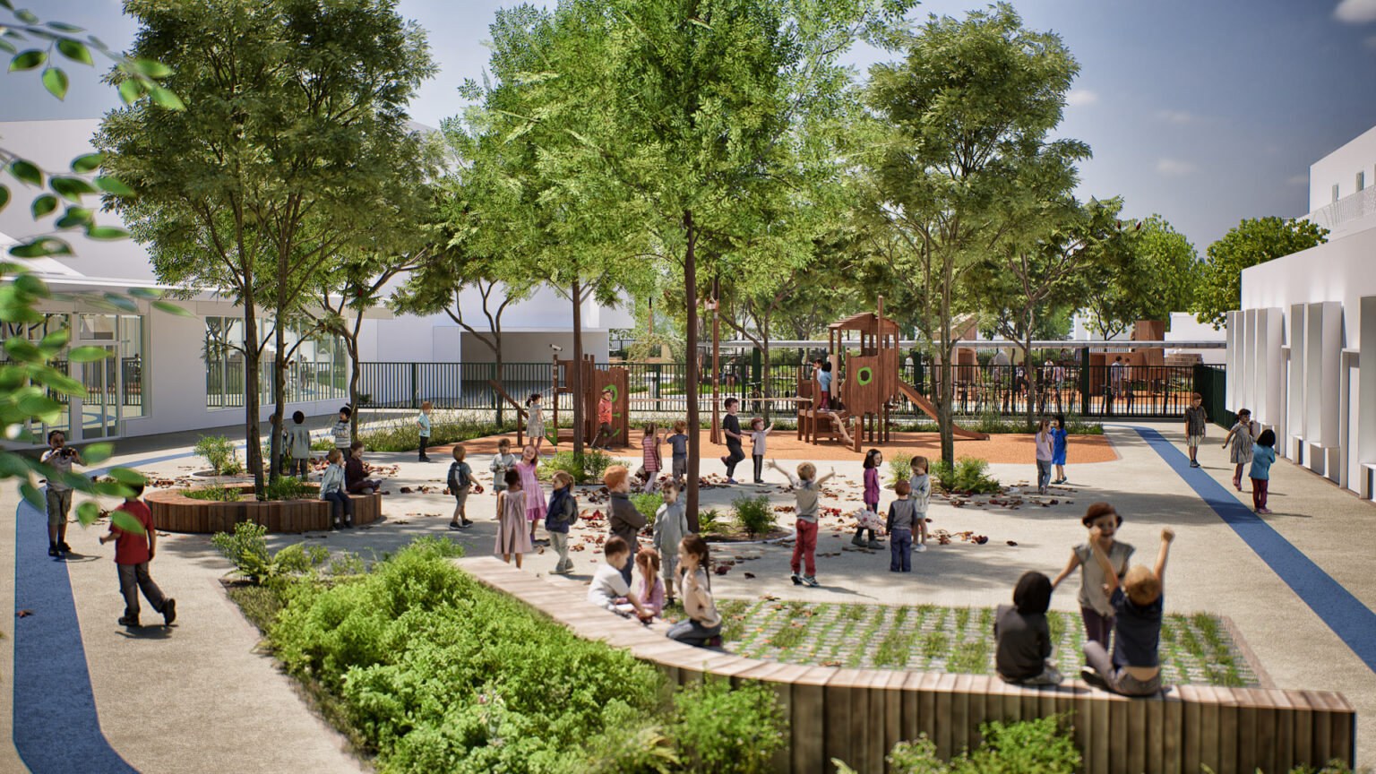 Réorganisation globale du groupe scolaire / Réaménagement des 3 cours de récréation (diversification des usages, végétalisation et désimperméabilisation des sols), du terrain de sport et des espaces publics aux abords (parvis, trottoirs).